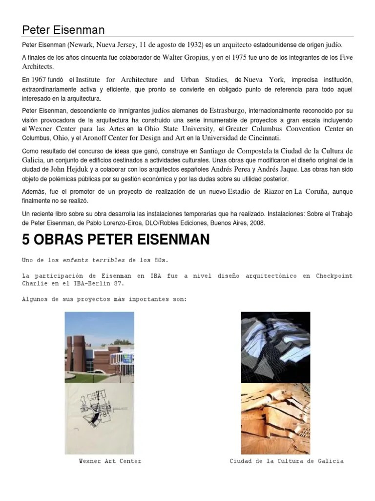 Tras el rastro de eisenman.. Internationally acclaimed architect peter eisenman established his professional practice in 1980. Cynthia davidson (ed.) akal, madrid. Peter eisenman (newark, nueva jersey, 11 de agosto de 1932) es un arquitecto estadounidense de origen judo. 17/09/2018 · el arquitecto peter eisenman (11 de agosto de 1932) es el autor de obras arquitectónicas emblemáticas como el centro wexner de las artes visuales en ohio, el aronoff center de la universidad de cincinnati o el monumento al holocausto situado junto a la puerta de brandemburgo en berlín.sus proyectos se caracterizan por un estilo definido como deconstructivismo moderno, muy próximo a las... Afinal, o arquiteto havia passado a maior parte da …